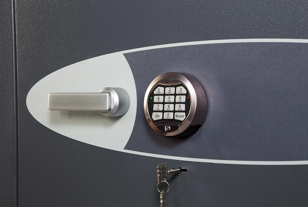 - На дверь модели HS9071E устанавливается пара замков высокой степени секретности (class 2, VdS) – двухбородочный ключевой и электронный Phoenix с защитой от подбора кода и набором полезных в плане безопасности и удобных функций: сочетание мастер-кода с кодом пользователя (основной владелец может менять его), Time Delay (окно открытия и временна́я задержка), Dual Code (двойной код) и пр. Область замков усиливается твердосплавной пластиной из легированной стали.