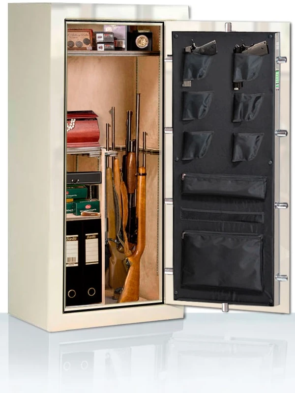 - Эту вместительную модель можно использовать не только для хранения оружия и боеприпасов. В ней достаточно места и для других предметов, которые вы хотите сберечь от огня и кражи: важных бумаг, денег, драгоценностей. Для их удобного размещения предусмотрены вертикальная перегородка и полочки.
