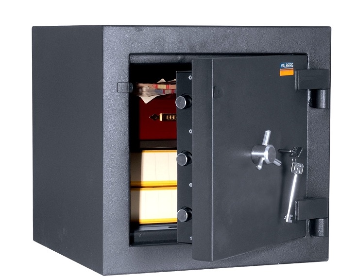- На дверь сейфа устанавливается ключевой замок KABA MAUER производства Германии (в комплекте два ключа) и трёхсторонняя усиленная ригельная система запирания, а также система блокировки ригельного механизма при взломе.